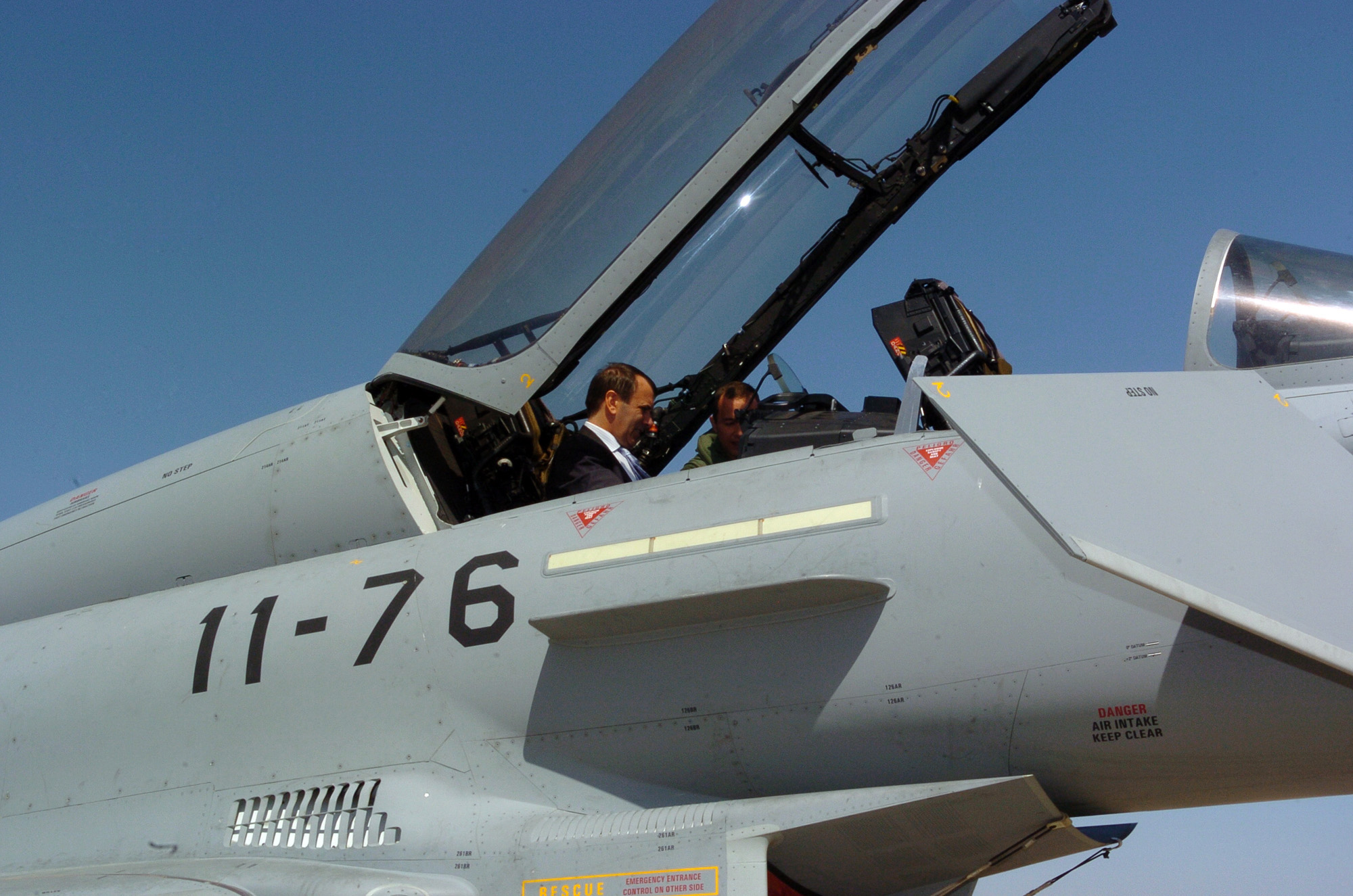 José Antonio Alonso, Ministro de Defensa, sobre un avión de combate 'Eurofigther' recibe las explicaciones que el piloto le da sobre el mismo