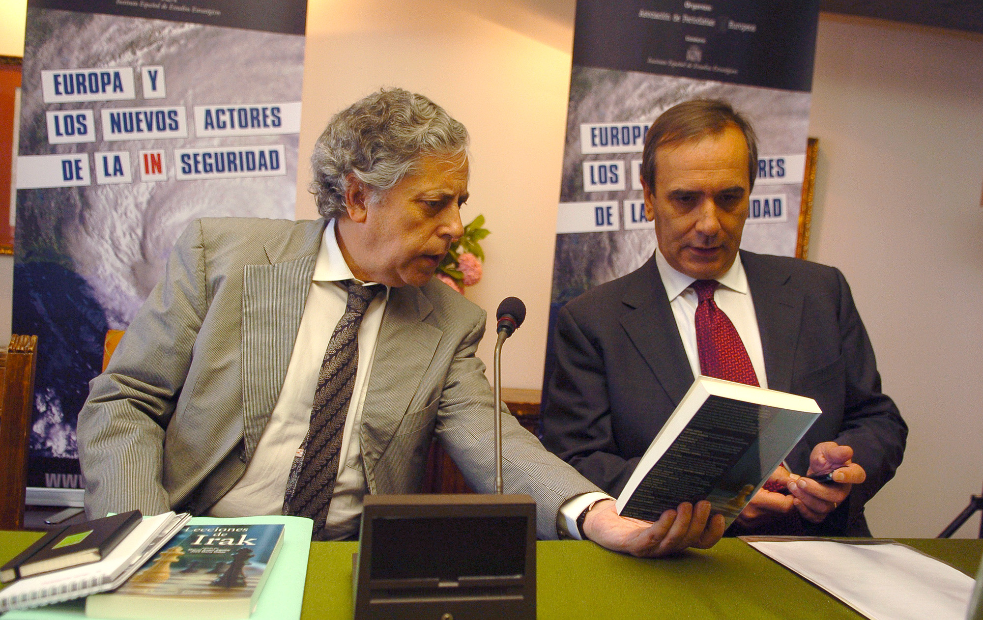 El ministro de Defensa, José Antonio Alonso, y el secretario general de la asociación de periodistas europeos, Miguel Angel Aguilar en el seminario internacional de Seguridad y Defensa en el Parador Nacional de Toledo