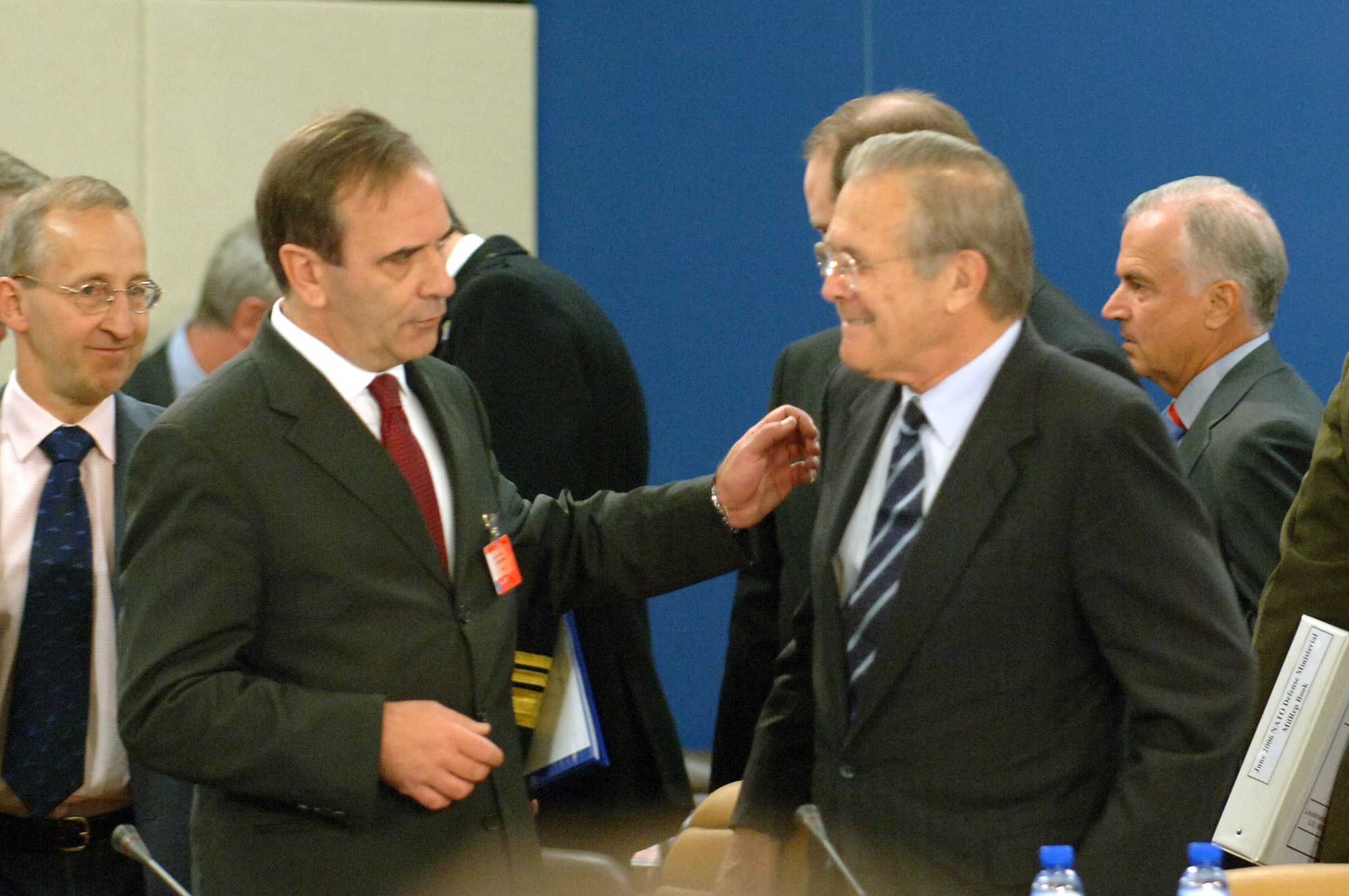 El Ministro de Defensa, José Antonio Alonso, saluda a su homólogo Rumsfeld, Secretario de Estado de Defensa de los E.E.U.U.