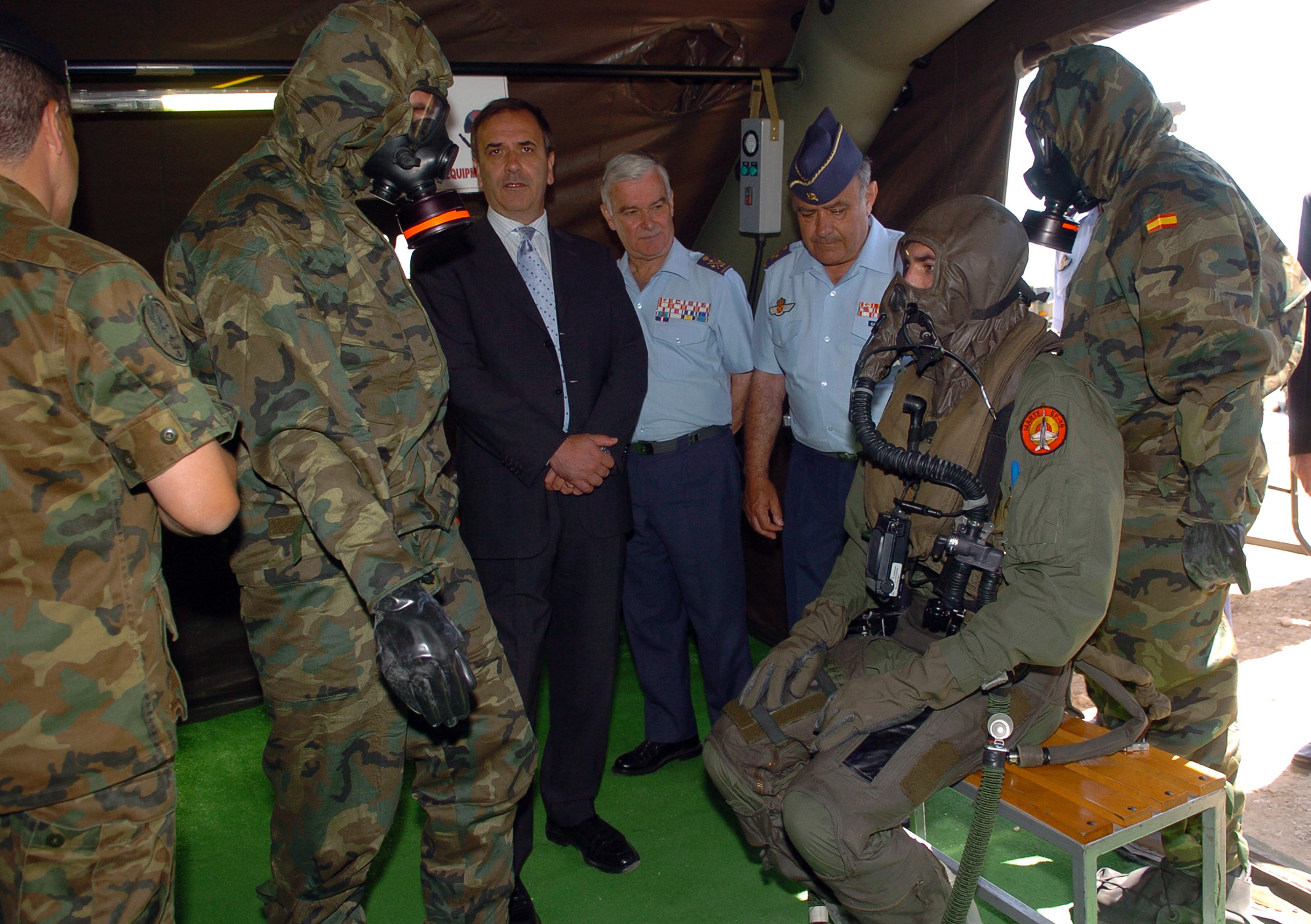 Ministro de Defensa, José Antonio Alonso, puede comprobar como se descotamina un piloto rescatado de una zona contaminada de radioactividad.