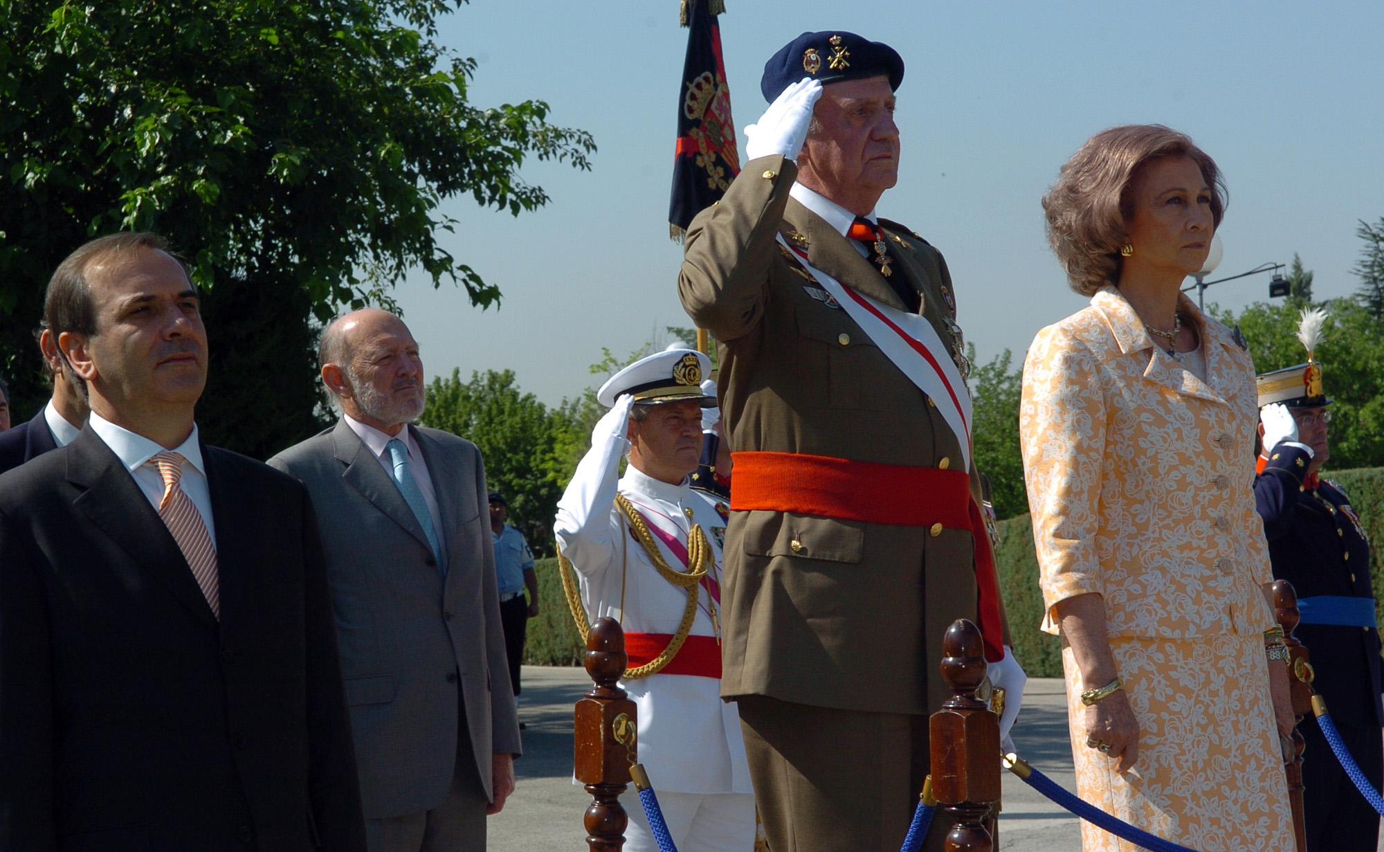 SS.MM. Los Reyes reciben honores a su llegada al acuartelamiento de el Pardo, les acompañan el ministro de Defensa y otras autoridades civiles y militares