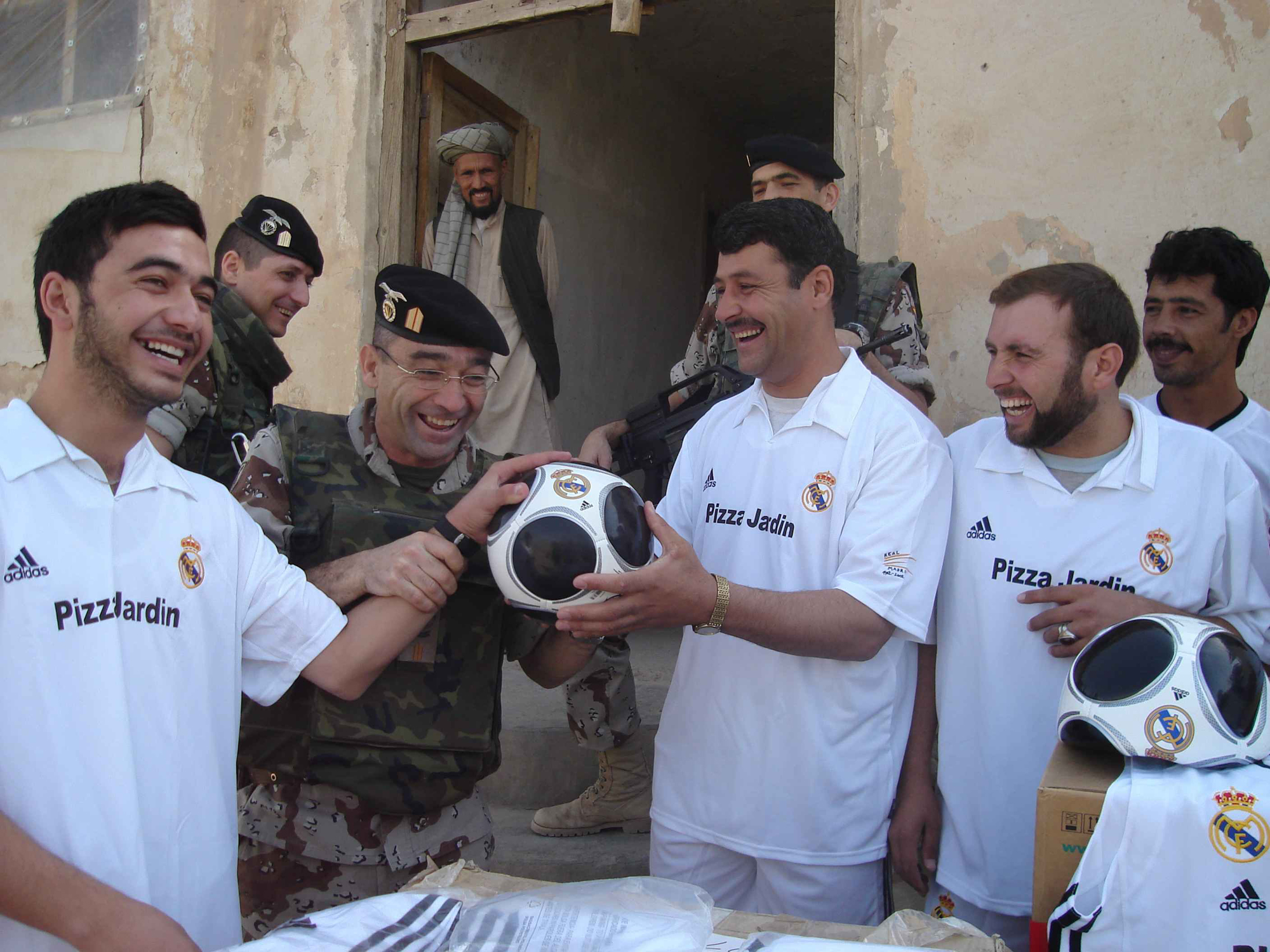 Paracaidistas españoles del Equipo de Reconstrucción Provincial (PRT) en la provincia de Badghis (Afganistán) han entregado hoy una serie de equipaciones deportivas de fútbol y voleibol, donadas por el Real Madrid.