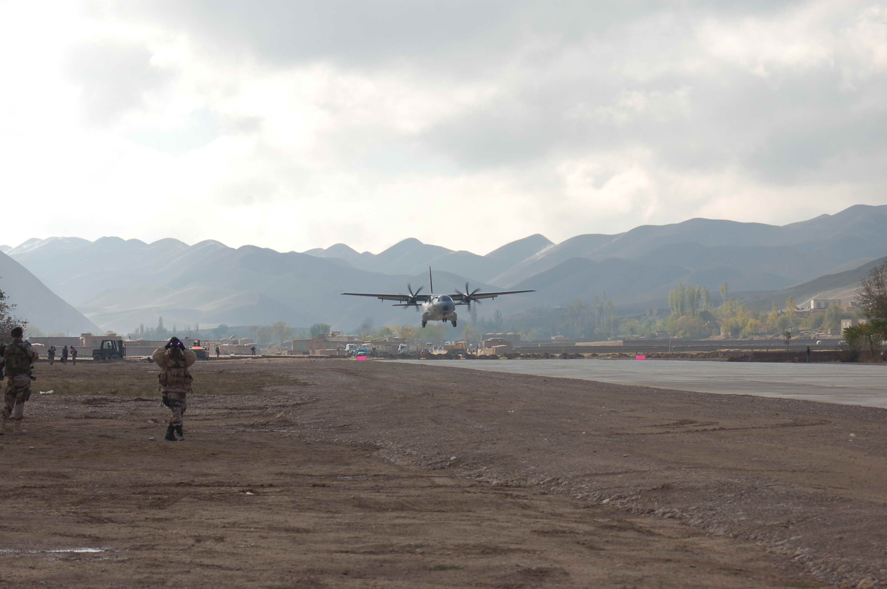 Avión del Ejército español procedente de Herat, con personal y material para la base militar en Qala e Naw realizando con éxito una toma de reconocimiento sobre la nueva pista