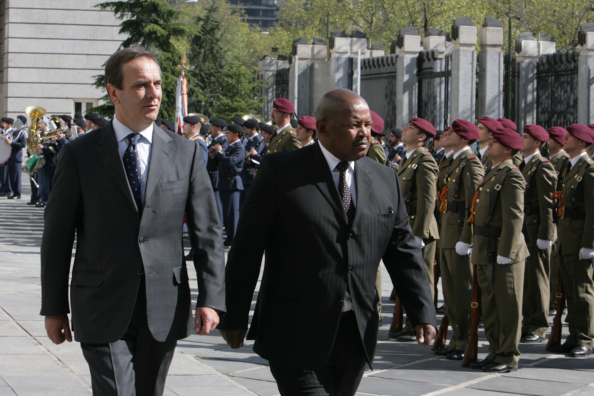 José Antonio Alonso, ministro de Defensa, con su homólogo de la República de Sudáfrica, Mosiuoa Lekota, pasan revista a las toropas en la sede del Ministerio.