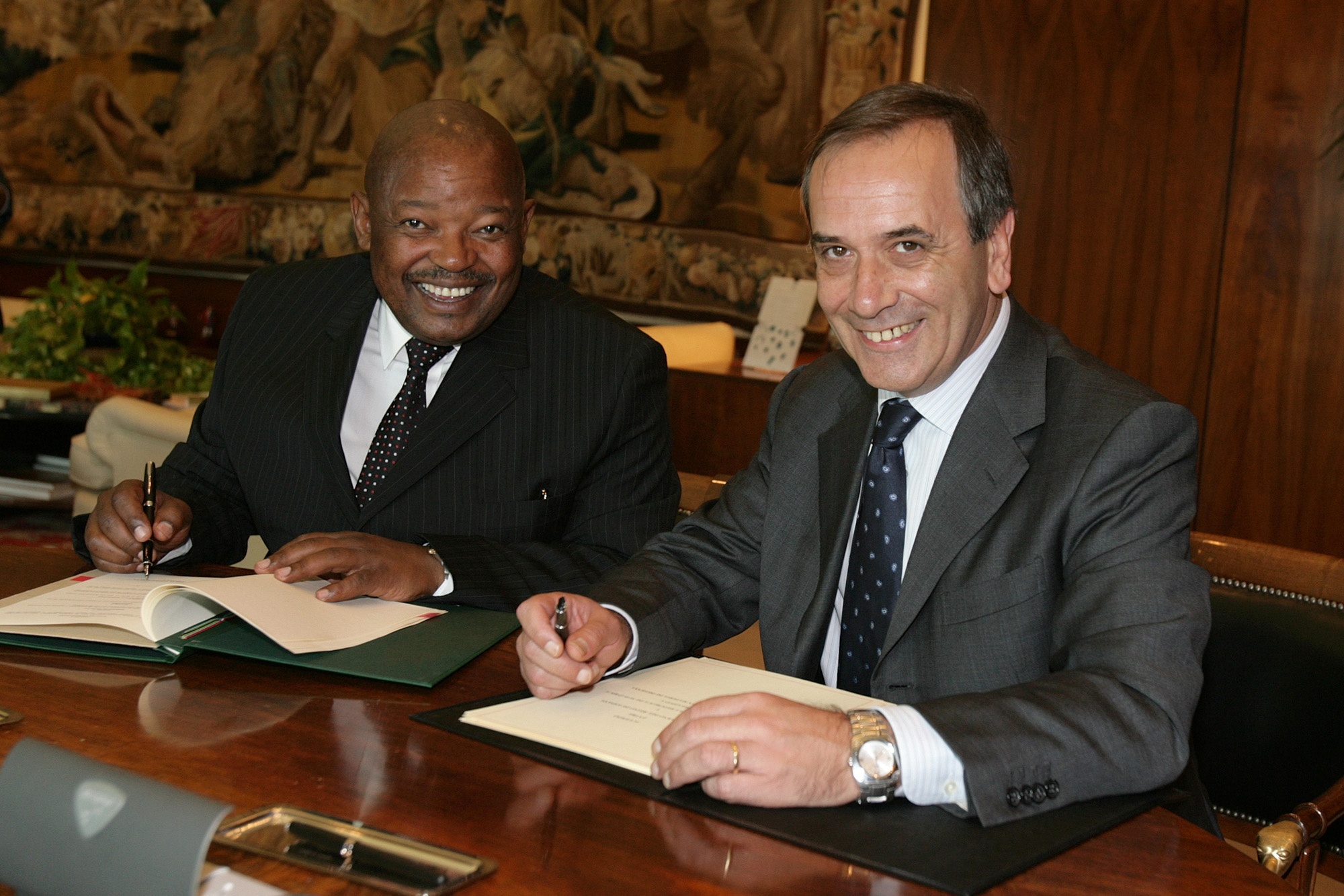 José Antonio Alonso, ministro de Defensa, con su homólogo de la República de Sudáfrica Mosiuoa Lekota en la firma del acuerdo.