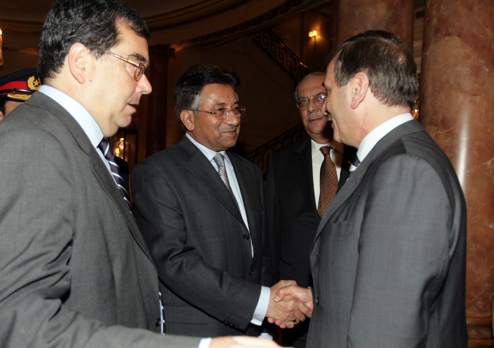 El presidente de la República Islámica de Pakisatán, Pervez Musharraf, y el ministro de Defensa, José Antonio Alonso, en el hotel Ritz de Madrid
