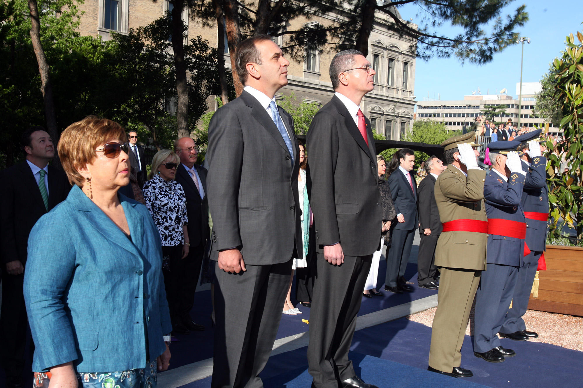 El minstro Alonso y Alberto Ruiz-Gallardón, alcalde de Madrid, presiden el acto de Izado de Bandera en la jardines del Descubrimiento de Madrid