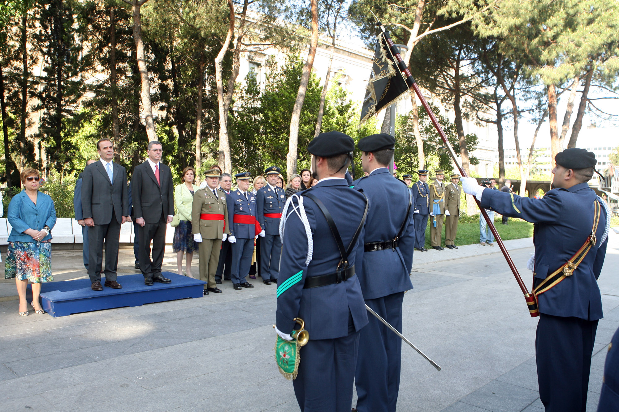 José Antonio Alonso, ministro de Defensa y Alberto Ruiz-Gallardón, alcalde de Madrid, despiden a la Fuerza del Ejército del Aire que ha rendido hionores a la Bandera