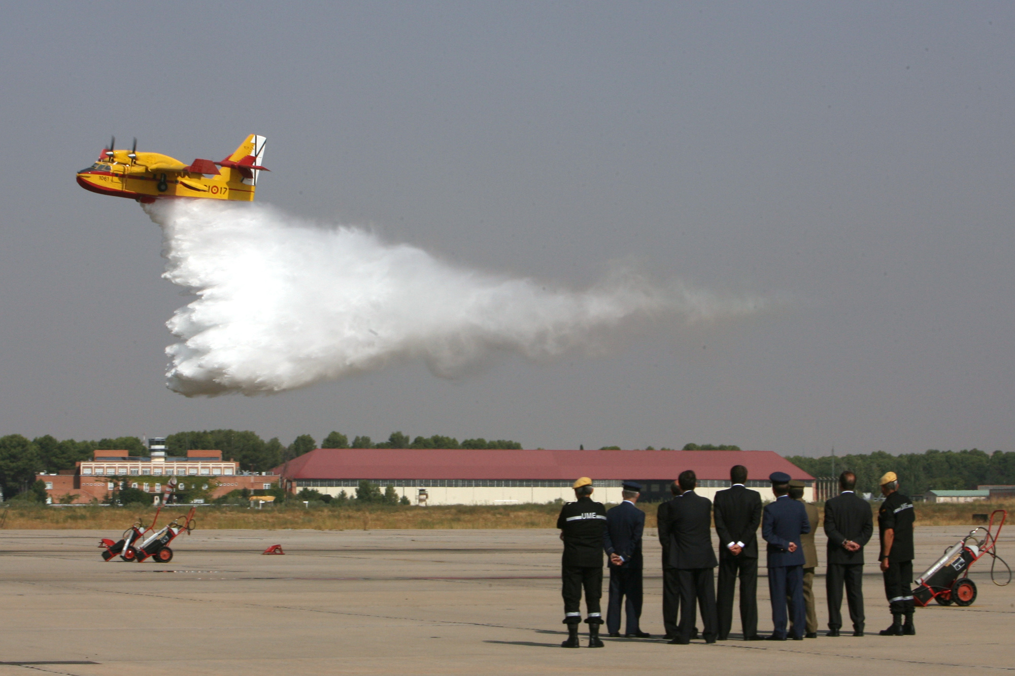 Un hidroavión Canadair CL-215-T realiza una descarga de agua en la Baser Aérea de Torrejón