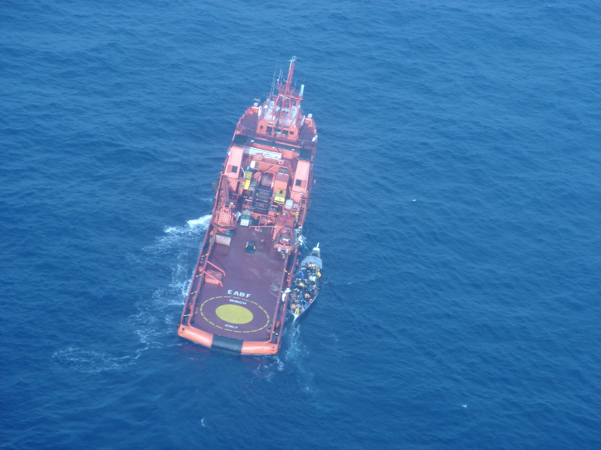 Vista aéra rescate en alta mar a los tripulantes de un cayuco.
