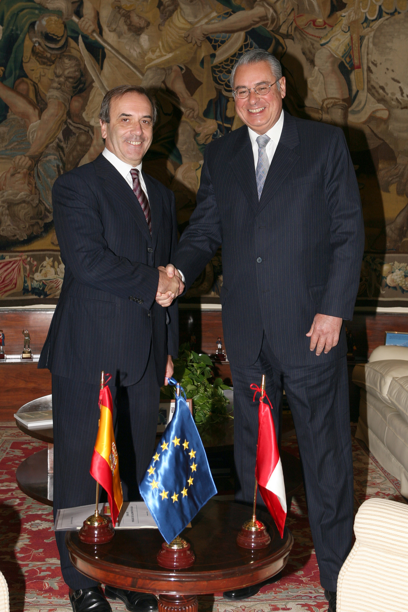 José Antonio Alonso, ministro de Defensa, con su homólogo de la República del Perú, Allan Wagner, durante su visita al Ministerio