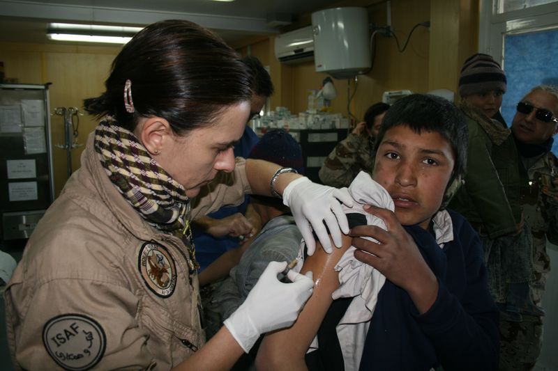Médicos militares españoles vacunan a niños de un horfanato en Herat (Afganistán)