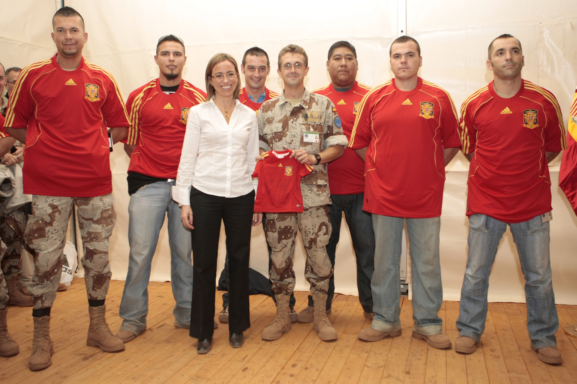 La ministra de Defensa con los miembros del destacamento 'Sirius' vistiendo la camiseta de la selección española
