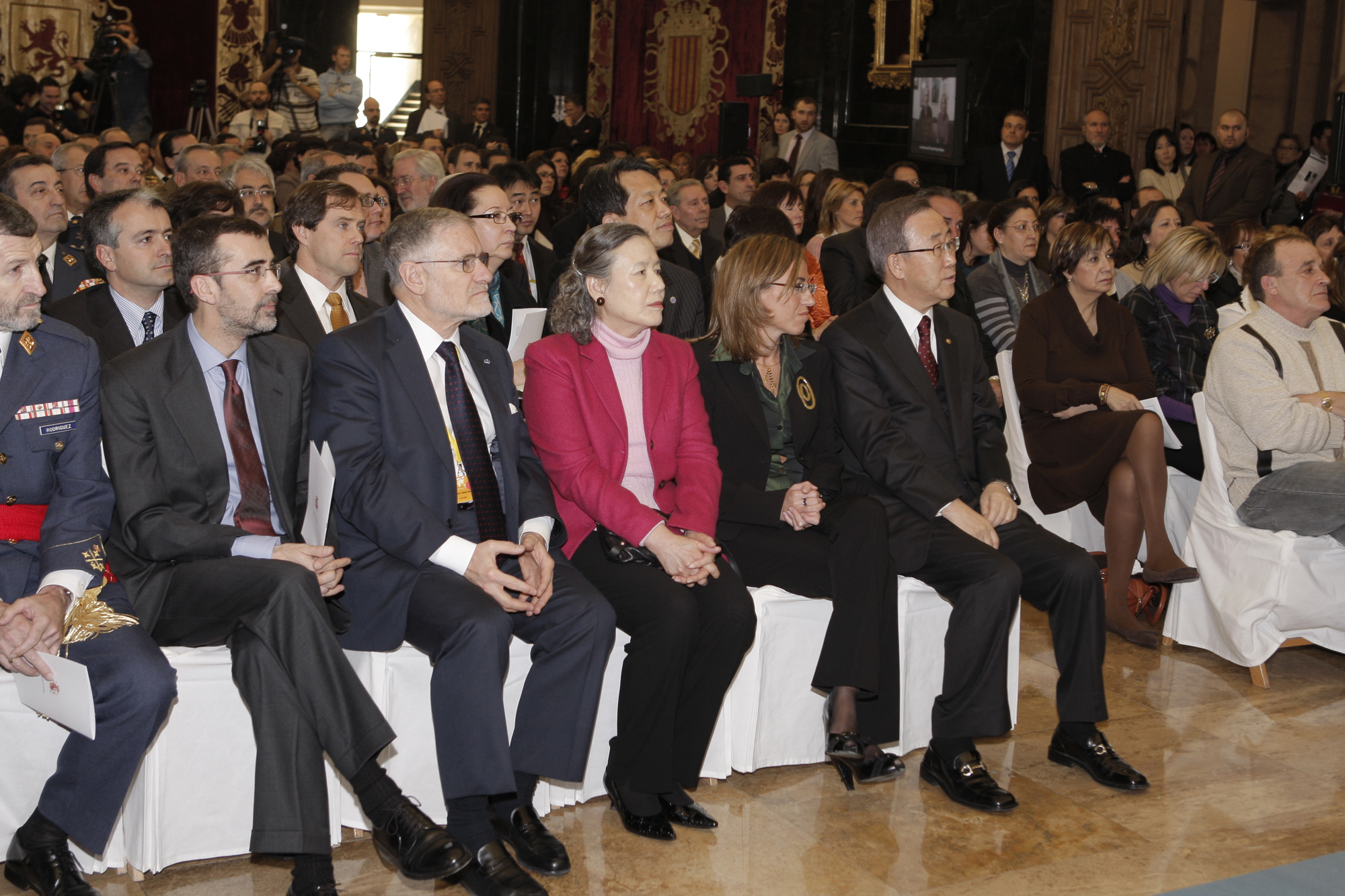 Ban Ki-moon y Carme Chacón durante el acto homenaje