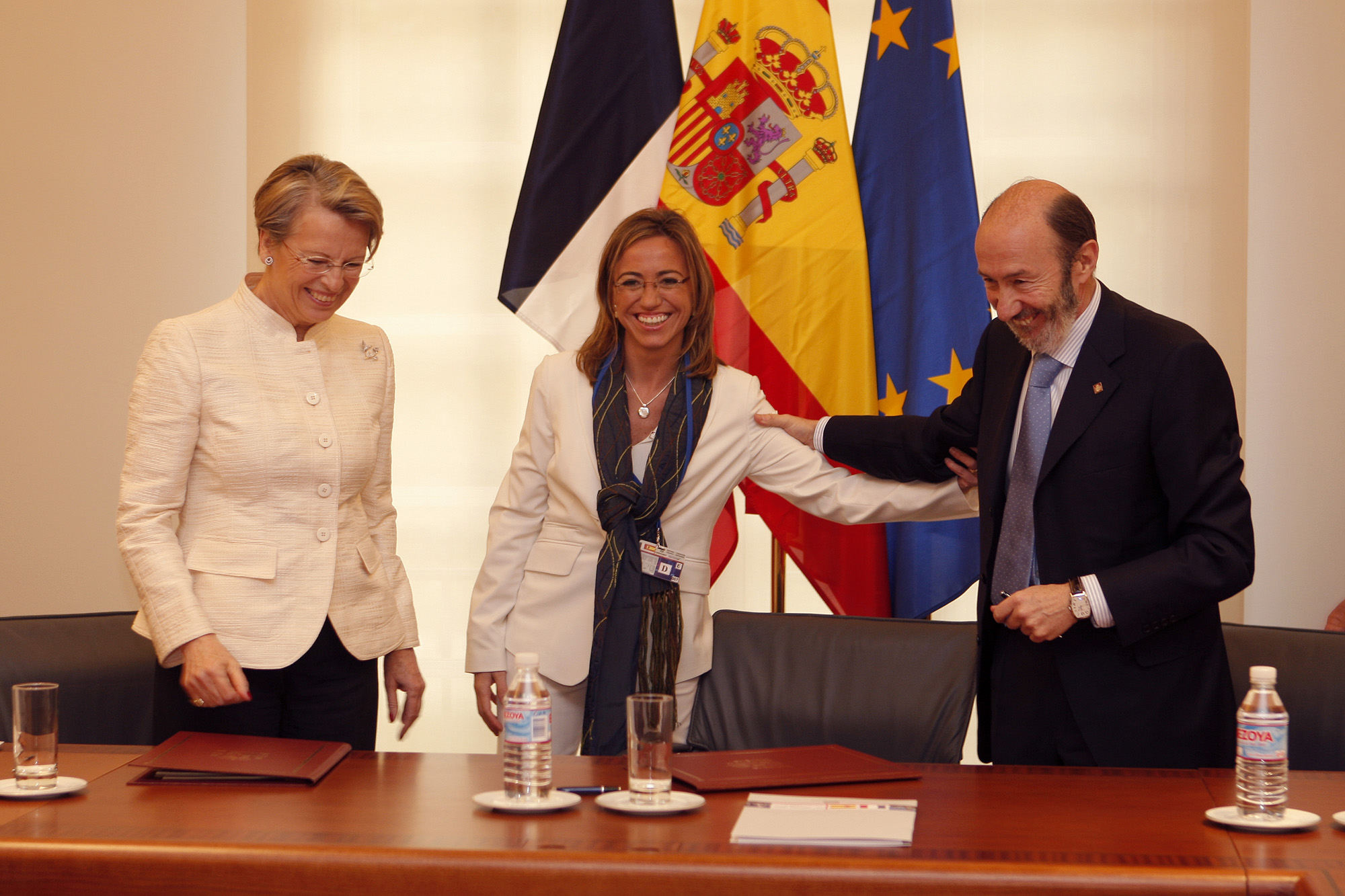 Carme Chacón en la firma del acuerdo, junto a los ministros del Interior de ambos países, Alfredo Pérez Rubalcaba y Michelle Alliot Marie