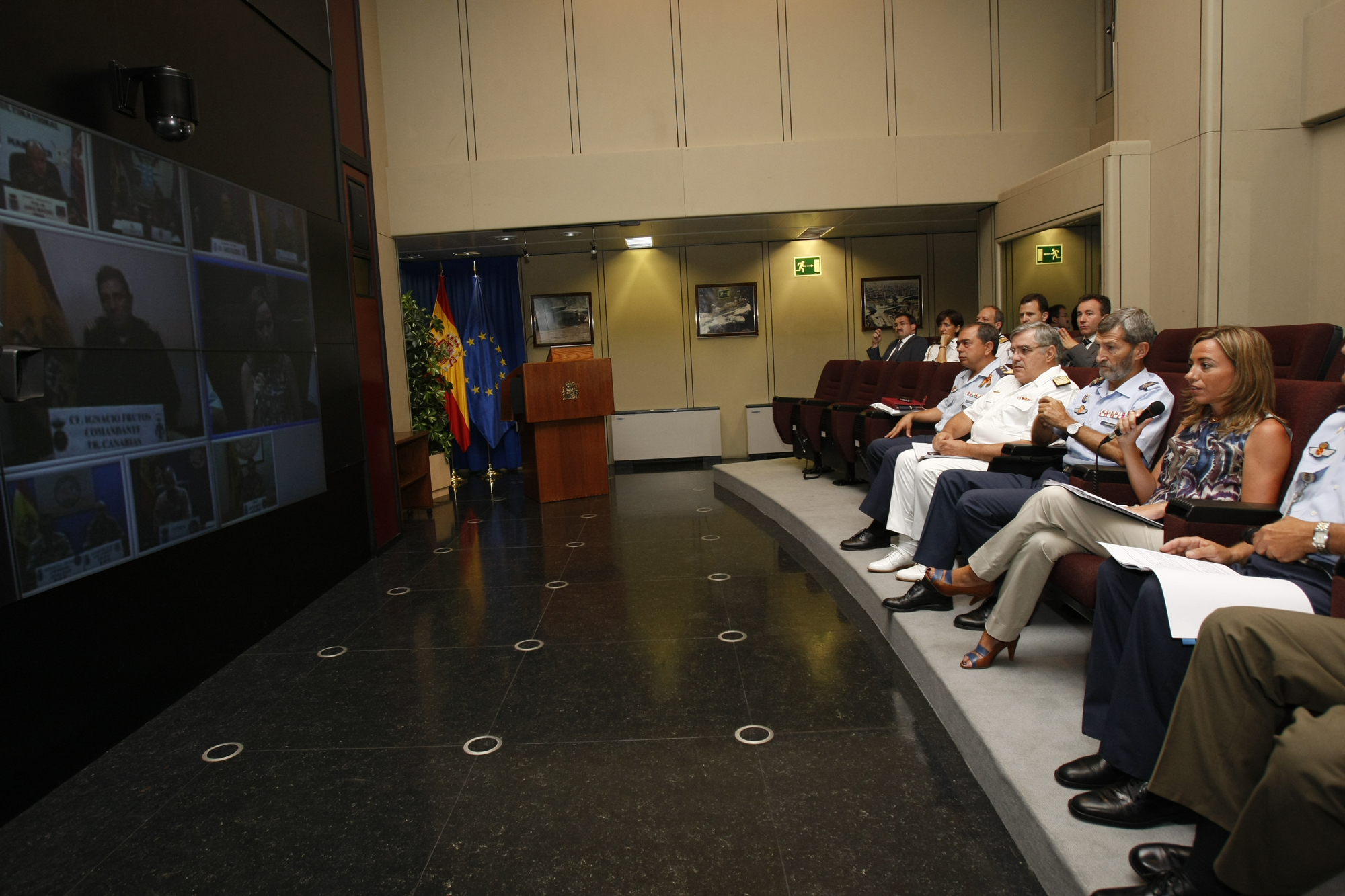 La ministra de Defensa, Carme Chacón,durante la videoconferencia periódica que mantiene con las misiones en el exterior