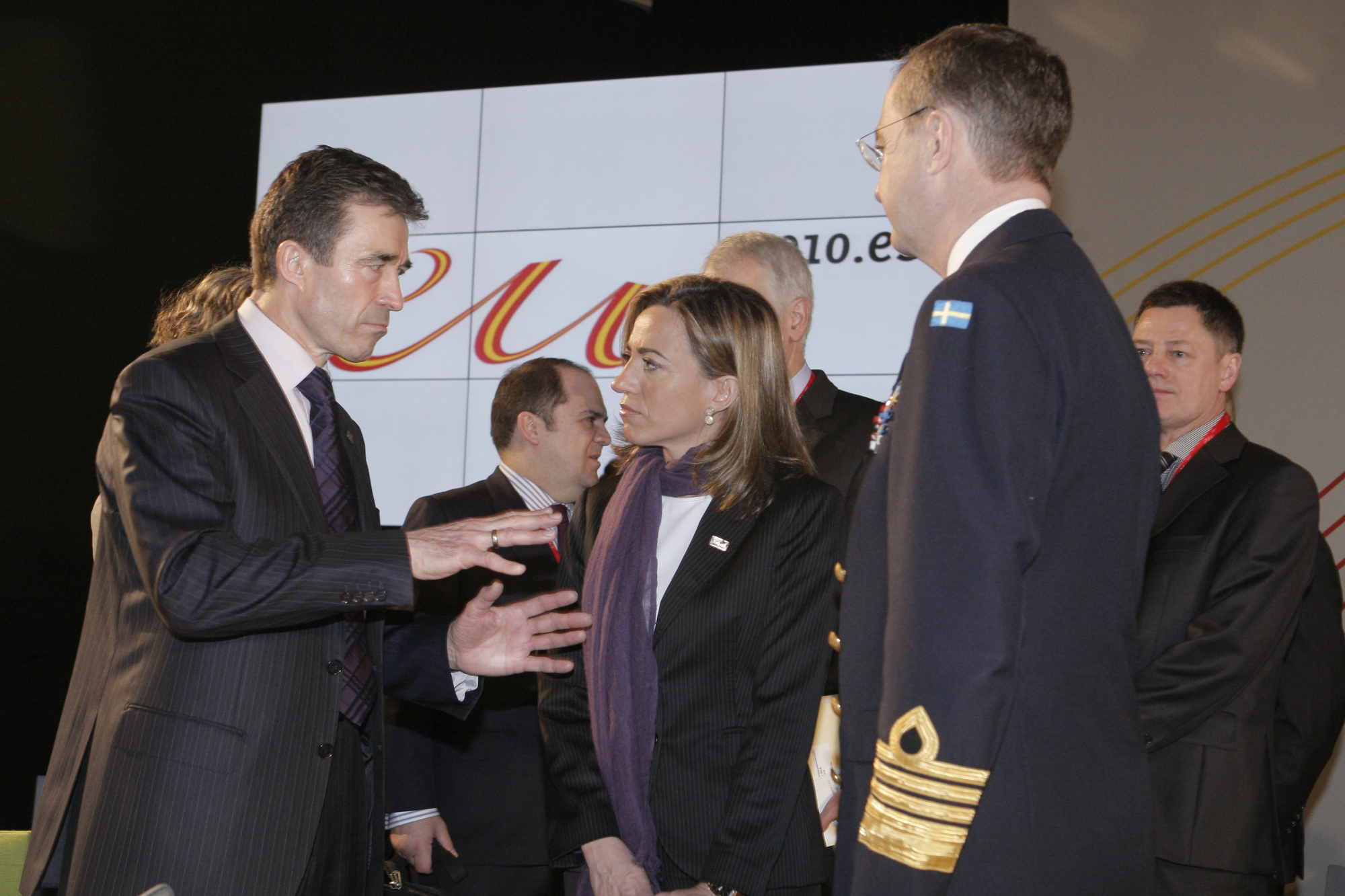 La ministra Chacón junto a Fogh Rasmassen, secretario general de la OTAN (izq) y el presidente del Comité Militar de la UE (dcha)