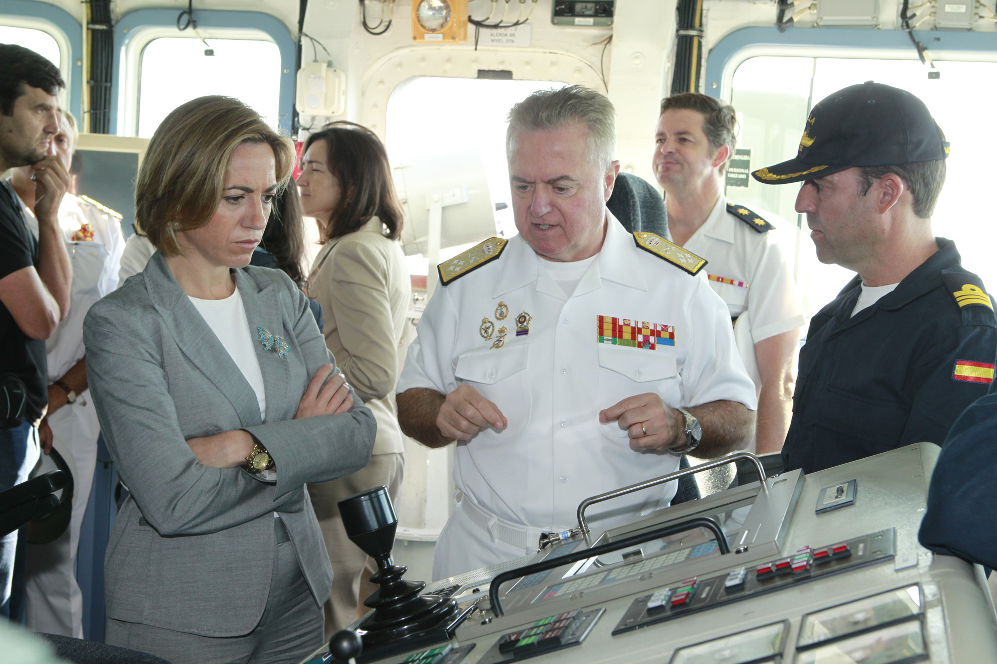 La ministra Chacón junto al Jefe de Estado Mayor de la Armada en el Cazaminas 'Sella'
