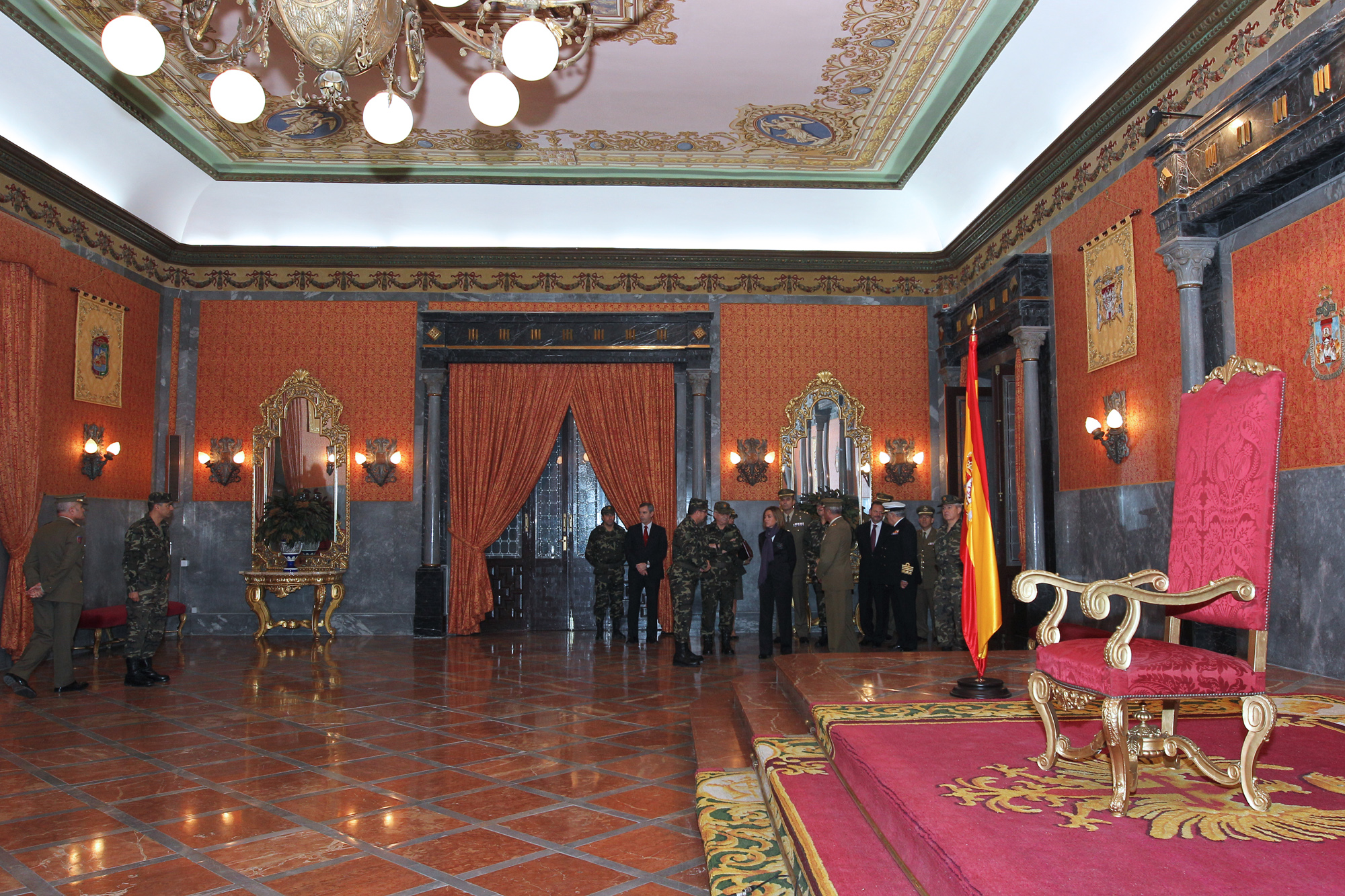 La ministra de Defensa, Carme Chacón, acompañada por el jefe del Estado Mayor del Ejército, Fulgencio Coll Bucher, y el jefe de la Fuerza Terrestre, Virgilio Sañudo Alonso de Celis, durante la visita al Salón del Trono