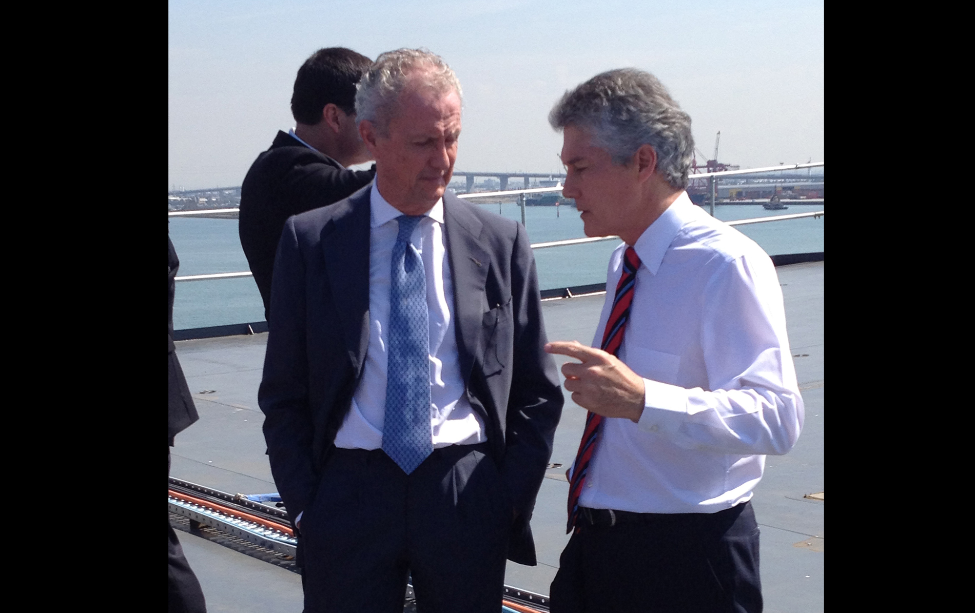 Los ministros de Defensa de España, Pedro Morenés, y de Australia, Stephen Smith, conversan en la cubierta del buque de aprovisionamiento de combate (BAC) Camberra, de la Armada australiana, proyectado y en parte construido en astilleros españoles