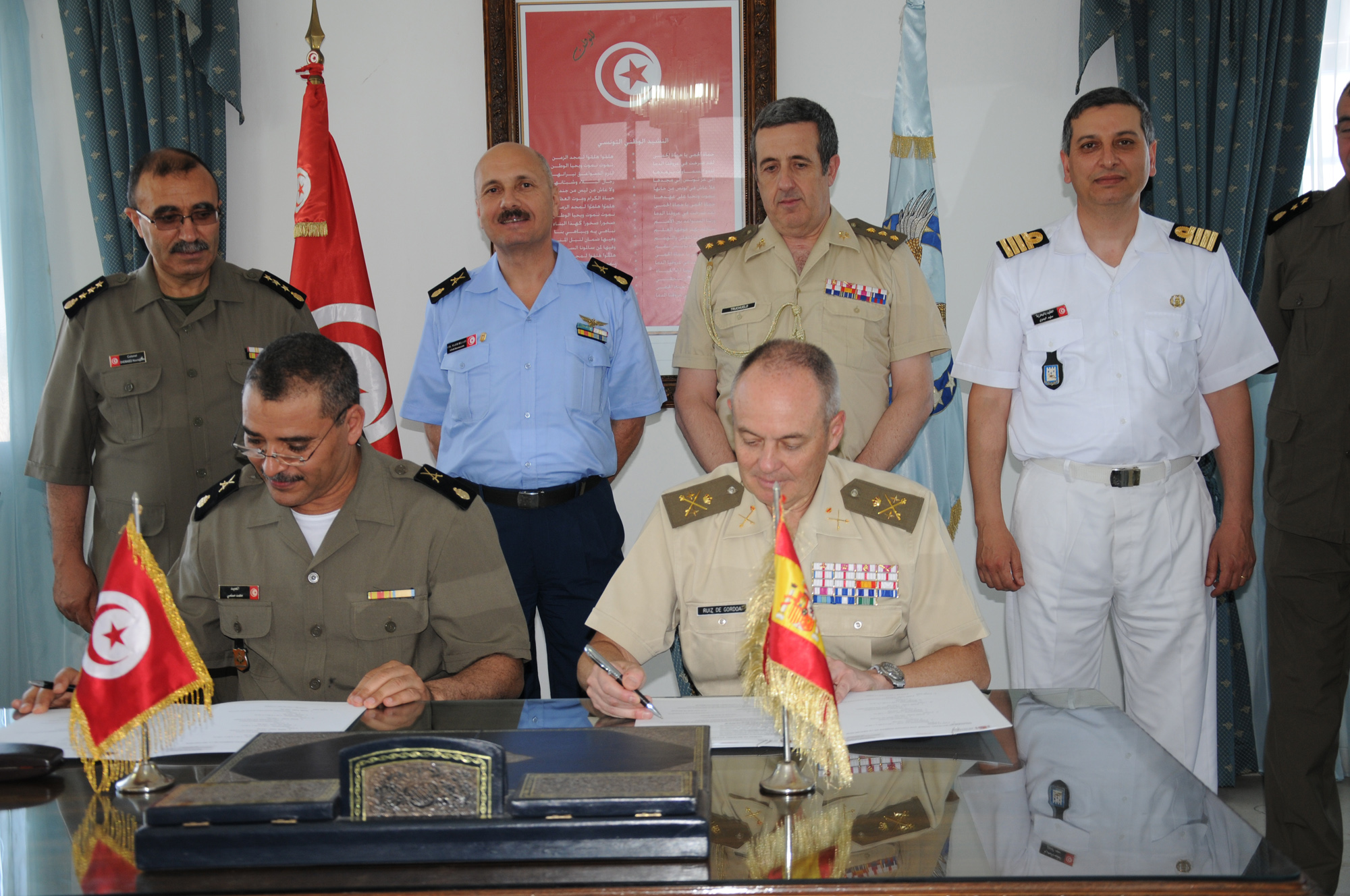 El Subdirector General de Planes y Relaciones Internacionales del Ministerio de Defensa,general de División Luis Antonio Ruíz de Gordoa, hizo entrega ayer a las Fuerzas Armadas tunecinas, representadas por el Jefe del Estado Mayor del Aire de la República de Túnez, de material de protección para continuar con las actividades acordadas en el Plan de Cooperación Bilateral existente entre ambos países.