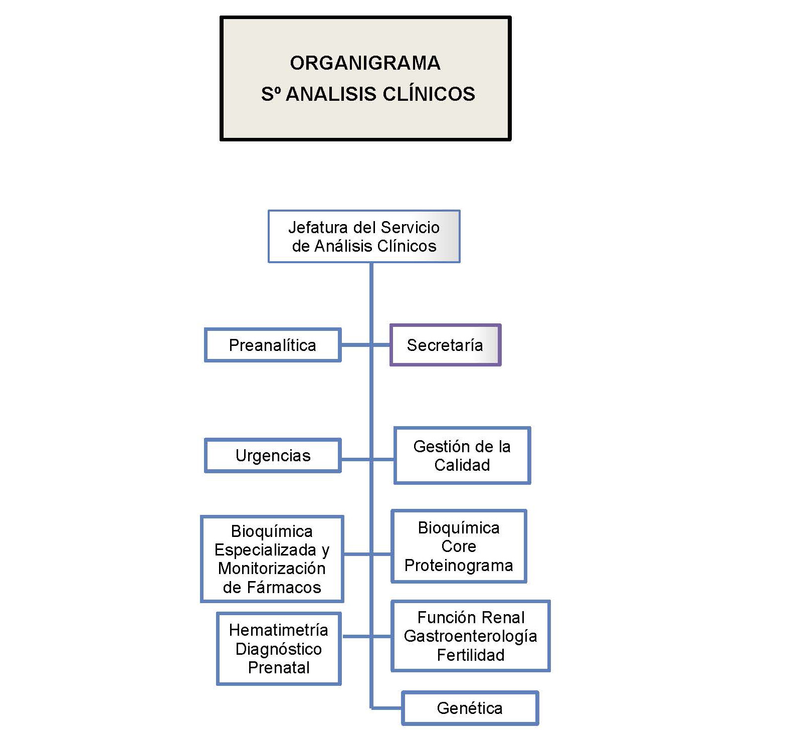 El Servicio de Análisis Clínicos se estructura en 6 secciones asistenciales (Hematimetría y Diagnóstico Prenatal, Función Renal, Gastroenterología y Fertilidad, Bioquímica Core y Proteinograma, Bioquímica Especializada y Monitorización de Fármacos, Genética y Urgencias), además de las secciones de Preanalítica, Calidad y Administración.