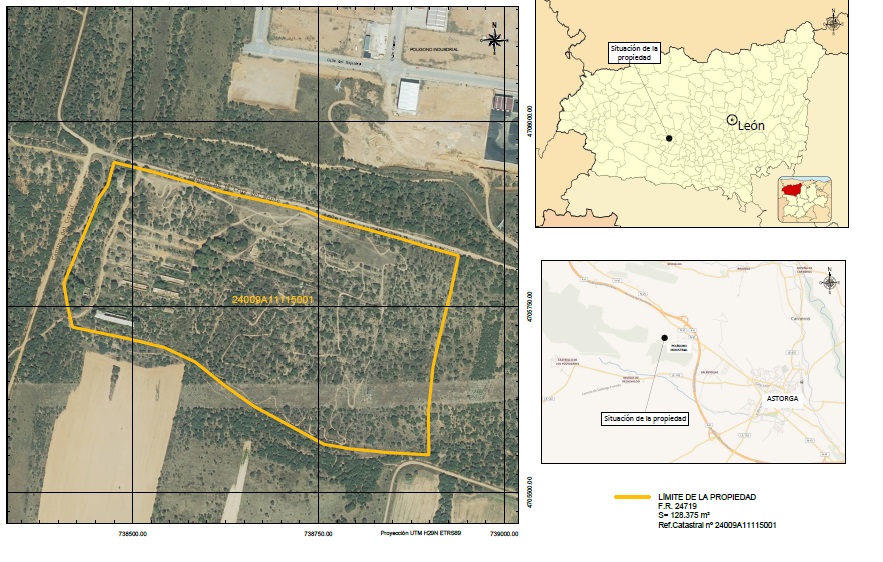 - La propiedad se encuentra en el SARDONERO, perteneciente al municipio de Astorga (León). Está situada a 1 km. aproximadamente al Norte de la localidad de Murias de Rechivaldo y a 3 km. aproximadamente al Oeste de Astorga.El acceso a la propiedad se realiza por el camino de la Cruz del Monte.En su parte sureste la vegetación es de monte bajo, y en la zona central/oeste hay encinas y pinos dispersos. En el centro existen algunos castaños, y en el tercio oeste es donde se situaban la mayor parte de los barracones, hoy en estado totalmente ruinoso.En su perímetro se encuentran situados mojones que delimitan la propiedad.Por la esquina sureste cruza, de este a oeste, una línea eléctrica de alta tensión de 132 kv., situándose una de las torres metálicas de cuatro apoyos en el interior de la propiedad.Existe otra línea eléctrica de media tensión que discurre en sentido sur-norte, apoyándose en postes de hormigón.