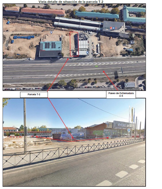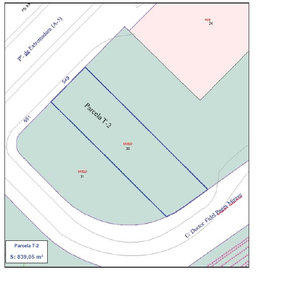 Se corresponde con la finca T-2 del proyecto de reparcelación del APR 10.01, situada en el Paseo de Extremadura nº 549.Se trata de una parcela de terreno libre de edificaciones de forma irregular, conformada por cuatro lados rectos y uno curvo, que encierra en su interior una superficie plana y horizontal de 839,05 m2 de suelo, que linda:- al noroeste, en línea recta de 15,54 m, con la parcela de resultado correspondiente a red viaria RVG OESTE, Vía de servicio del Paseo de Extremadura.