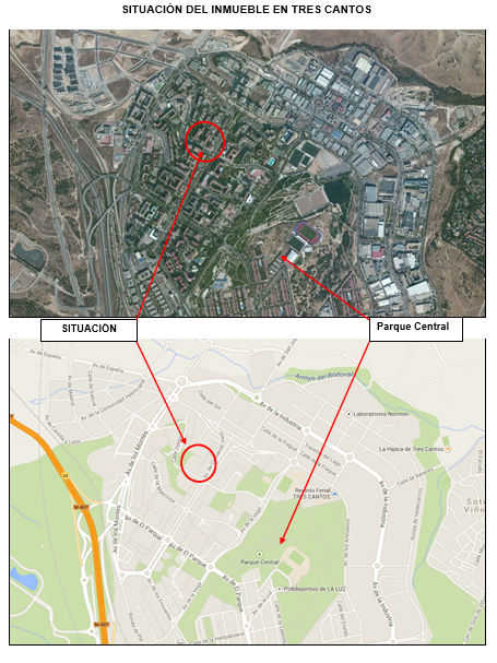La propiedad se encuentra en el término municipal de Tres Cantos (Madrid), en el Sector Escultores, dentro del conjunto inmobiliario formado por los portales nº 19, 20, 21, 22, 23, 24, 25, 26, 27 y 28 de la calle Yelmo. En el bloque que componen los portales nº 24, 25, 26, 27 y 28.En la planta baja de los portales nº 25 y nº 26, entre ambos.Tiene su acceso principal desde la calle peatonal, perpendicular a la calle Yelmo.