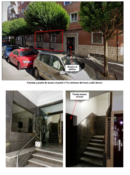 Se ubica en la planta baja del portal nº 9 de la calle Aurora, a mano izquierda en el sentido de entrada al edificio. Se accede al mismo desde el portal. No cuenta, por tanto, con acceso directo desde la calle.Se trata de un local comercial con forma de polígono irregular de varios lados. Tiene una fachada a la calle Aurora y otra opuesta a patio interior de manzana.Se desarrolla en planta baja, si bien a una cota elevada respecto al nivel de la calle. Es necesario salvar 6 peldaños para alcanzar la puerta de acceso.Se encuentra actualmente sin uso. Interiormente se divide en vestíbulo, tres locales, y aseo, que se ilumina a través de la galería que comunica el local con el que ocupa el bajo derecha. Cuenta con ventanas en sus tres fachadas libres, dos hacia la calle Aurora y cuatro ventanas al patio interior.La puerta de acceso es de madera, y la carpintería de los huecos de aluminio sin rotura de puente térmico y acero con vidrio sencillo, persianas, y enrejado metálico exterior. La parte superior de la fachada principal es de ladrillo visto, y el zócalo inferior de piedra natural.El material de solado varía en las diferentes estancias, siendo de madera, losetas de corcho, o cerámico. Las paredes se encuentran revestidas de yeso, y no cuenta con falso techo.En cuanto a las instalaciones, cuenta con instalación de electricidad, fontanería y saneamiento en uso, e instalación de calefacción anticuada.La superficie total construida del local es de 154,69 m², de los cuales 121,38 m² corresponden a la superficie que encierra el perímetro del local y los restantes 33,31 m² corresponden a la parte proporcional de elementos comunes.Certificado de Eficiencia Energética: En tramitación