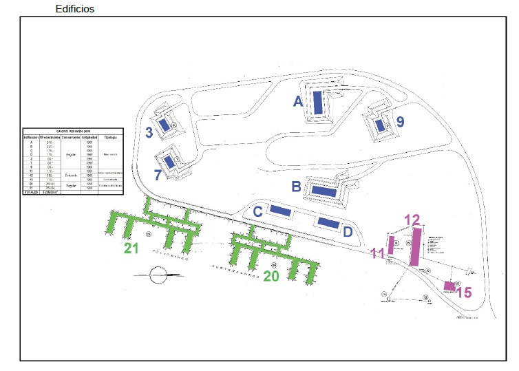 El acceso se efectúa desde la vía de servicio de la autovía A-610.Hay 8 criptas-cueva subterráneas, en dos grupos de 4, y con dos entradas en galería horizontal por cada grupo, con 1.527 m² construidos, incluyendo las galerías. Se identifican en el gráfico que sigue con los números 20 y 21.Hay 7 naves-almacén a cielo abierto, de gran solidez, con una planta de altura, identificadas con las letras A, B, C, D y números 3, 7 y 9, que suman 1.102 m² construidos.Hay otras 3 construcciones a cielo abierto, también de una planta, identificadas con números 11, 12, y 15, que suman 610 m² construidos, en estado deficiente.- Calificación:
