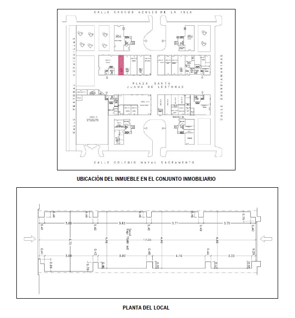 - La propiedad se encuentra en el término municipal de San Fernando (Cádiz), en el conjunto inmobiliario formado por los edificios nº 2 y 4 de la calle Cascos Azules de la Isla, nº 1, 2, 3 y 4 de la Plaza Santa Juana de Lestonac y nº 1 y 3 de la calle Colegio Naval Sacramento.Se trata de un local situado junto al portal número 3 de la Plaza Santa Juana de Lestonac, con acceso por dicha plaza y por el pasaje trasero que desemboca en la calle Cascos Azules de la Isla. Su forma es rectangular y forma medianera con los locales nº 2 A1 y nº 2 de su mismo portal.Las fachadas están enfoscadas y pintadas y tienen una longitud aproximada de 5 metros. En cada una de ellas hay una puerta de garaje, basculante hacia la Plaza Santa Juana de Lestonac y seccional hacia el pasaje trasero con un desnivel desde la calle de 4 centímetros.El local no dispone de ventanas ni de sótano, estando asentado directamente sobre el terreno.Interiormente el local es diáfano, cuenta con alumbrado y una pila con toma de agua. Las paredes están pintadas y está solado con baldosa de terrazo.Etiqueta de Eficiencia Energética: Calificación D Consumo – Calificación C Emisiones