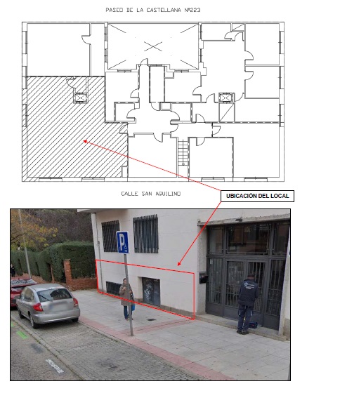 - El local se encuentra en el edificio conformado por dos portales situados simétricamente respecto a un patio central común y domiciliados respectivamente, en la calles San Aquilino número 30 y Paseo de la Castellana, número 223.Concretamente en la zona noreste del barrio de Almenara – 064, perteneciente al Distrito Tetuán – 06 de la capital.Se trataría del local a nivel semisótano adyacente a la calle San Aquilino y a un vial peatonal privado que separa el edifico de una zona verde sita en la misma manzana.Acorde con los informes emitidos al respecto, el inmueble se encuentra, “en términos generales, en buen estado, sin patologías estructurales aparentes”, de manera que el local está “actualmente sin luz, clausurado y sin uso, por lo que tienen deficiencias de baja gravedad, como humedades, desperfectos en los acabados y suciedad general”.Actualmente, el local se distribuye en una estancia principal, otra secundaria delimitada de la anterior por paramentos conformados a partir de una perfilería metálica auxiliar, las cuales se encontrarían complementadas con dos estancias menores, aseo y cuarto, así como un pasillo que permite el acceso a una de las dos entradas con las que cuenta este local. Igualmente, en el interior del local existe un hueco delimitado, aunque con una puerta de acceso al mismo, destinado a patinillo vertical de ventilación de los aseos de esa parte del edificio, y por tanto, elemento común del mismo.Aparte de los indicados a nivel de su planta, existe otro acceso directo desde la calle San Aquilino resultante de la ampliación de la apertura del ventanal original hasta el nivel de forjado superior, posibilitando una entrada alternativa de material.