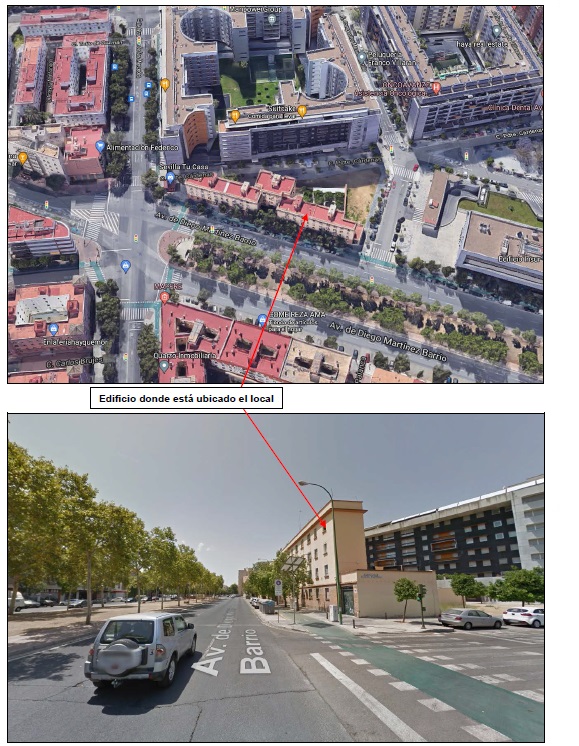 - La propiedad se encuentra en el término municipal de Sevilla, en el conjunto inmobiliario designado con el nº 12 de la Avenida Diego Martínez Barrio. Es colindante con el portal nº 5 de dicho conjunto, formando esquina entre la Avenida de su situación y la calle Compositor Manuel Castillo.Tiene acceso independiente desde la Avenida Diego Martínez Barrio.Se trata de un local comercial con forma de polígono regular en forma de “L”.La fachada principal es de ladrillo cara vista. La puerta de entrada (puerta automática seccional) es metálica ciega. Tiene una ventana de madera sin reja, orientada al suroeste, hacia el patio común del edificio. Limita al sureste y suroeste con separación física, al noroeste tiene fachada a solar trasero y al noreste tiene fachada a calle Castillo.Interiormente el local es totalmente diáfano. No dispone de aseos ni otras estancias que altere su distribución. El solado es de baldosas de hormigón formando cuadros. Parte de las paredes del recinto son de ladrillo cara vista y otras se encuentran revestidas con mortero y acabado con pintura. El techo esta revestido de pasta de yeso sin pintar, dejando una altura libre 3,55 m, aunque en alguna zona se reduce por la estructura a 3,30 m.