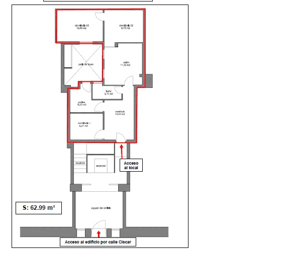 No tiene, por tanto, acceso directo desde vial público.Se trata de un local interior, vivienda de portería en el momento de la construcción del edificio, con forma de polígono irregular en forma de “L”, que linda con locales destinados a usos distintos del de vivienda, cuya distribución está compuesta por vestíbulo, cocina, salón, un aseo y tres dormitorios.No tiene fachada a vial público. Tiene fachada a patio interior con dos ventanas y al que se accede directamente desde la cocina.El pavimento es de baldosa hidráulica, terrazo y gres, según zonas. Carpinterías interiores y exteriores de madera.- Calificación: