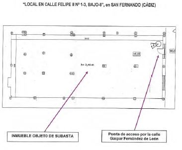 Se encuentra en el término municipal de San Fernando (Cádiz), en la planta baja de un edificio de viviendas situado en la calle Felipe II, 1-3-Bajo-8.Tiene forma rectangular, con tres paredes perimetrales medianeras, teniendo la entrada por la calle Gaspar Fernández de León. Las paredes exteriores están enfoscadas y pintadas y tiene dos huecos de ventanas a la calle Gaspar Fernández de León, protegidos con rejas fijas de barrotes y pletinas de acero. La puerta de acceso es metálica, de una hoja abatible. Para el acceso al local tiene un peldaño de 12 cm. Interiormente es diáfano. Tiene el suelo de hormigón fratasado, techo enlucido dejando una altura libre de 3,46 metros, con algunas paredes enfoscadas y pintadas y otras sin revestir. Está asentado en el terreno directamente, no existiendo sótano bajo él.