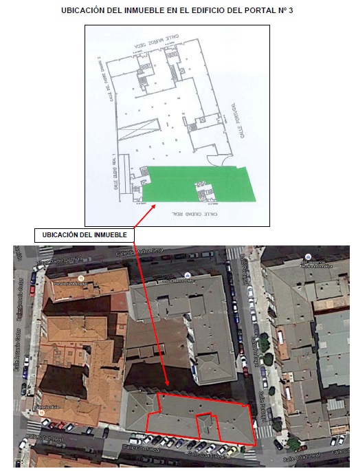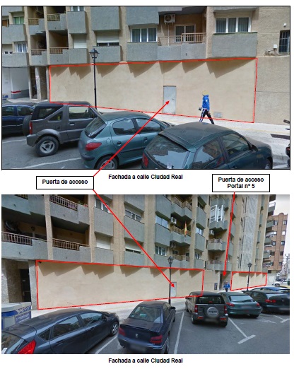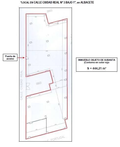 - La propiedad está ubicada en la planta baja del bloque de viviendas formado por los portales números 3 y 5 de la calle Ciudad Real de Albacete.En la nota registral aparece como número 3 de la calle Ciudad Real y en la certificación catastral aparece como número 5 de la calle Ciudad Real. La puerta de acceso está situada entre el acceso a los portales 3 y 5 de la citada calle.Se trata de un local de forma rectangular con lados irregulares, con dimensiones características aproximadas 36 por 12,5 metros, formando esquina con la Calle Ciudad Real, en su fachada mayor, y con la Calle Portugal, en la menor. Tiene su acceso por una puerta de paso simple desde la Calle Ciudad Real, de modo que en su planta tiene un entrante que corresponde al portal y zonas comunes del número 5 de la misma calle.El local está en bruto, con cerramiento de fábrica de ladrillo macizo de medio pie enfoscado y pintado al exterior y sin revestir por el interior, y de ladrillo hueco doble en vanos interiores, también sin revestir al interior. Los paramentos horizontales son las propias soleras estructurales, esto es, hormigón en el suelo y forjado unidireccional sin revestir en el techo. Tiene acometidas de agua, saneamiento y electricidad pero sin instalación alguna.
