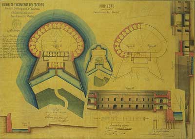 El fuerte dispone en cada frente de dos cañoneras, y en cada esquina que une los flancos hay un garitón.