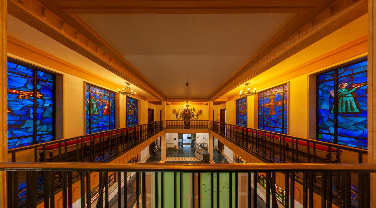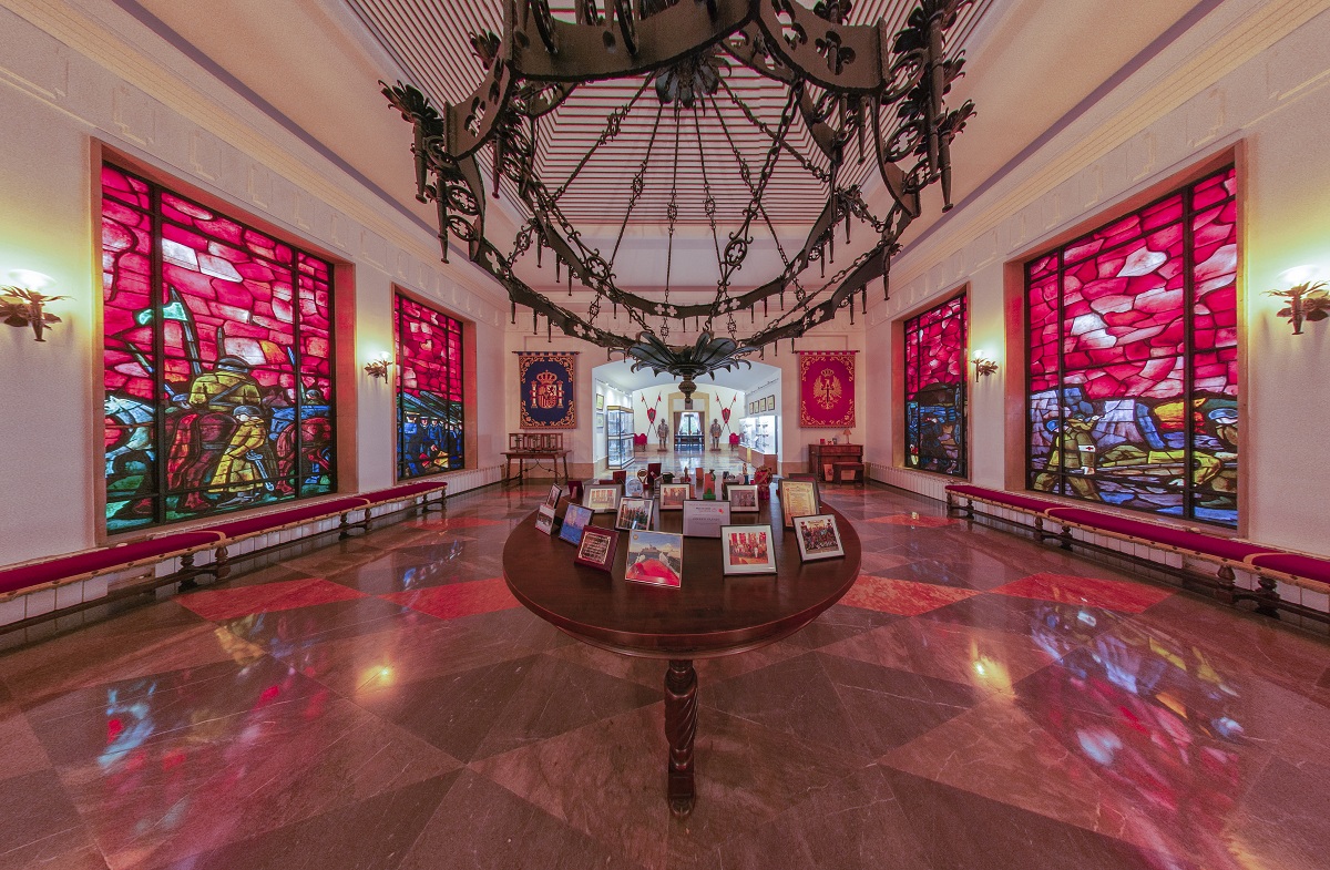 Recorrido guiado de las vidrieras de las plantas baja (dedicadas al legado histórico español de los Tercios de los siglos XVI y XVII), primera (dedicadas a Asturias) y segunda (dedicadas a los Ejércitos, con vidrieras de la Armada, la Aviación Militar y el Ejército de Tierra).